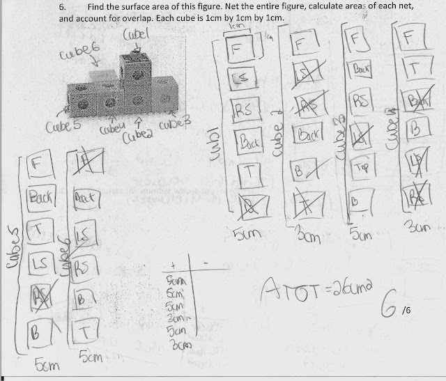 With this incredibly provocative preamble behind us, let’s take a look at what sparked this thought. A series of four responses (many more were worthy of exposure) to a typical question on surface area in my Grade 9 regular stream classroom. Each student “received” the same educational experiences, but came up with different ways of conceptualizing the task. People may dismiss this as fluke or ignore it all together, that is your prerogative.