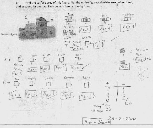 With this incredibly provocative preamble behind us, let’s take a look at what sparked this thought. A series of four responses (many more were worthy of exposure) to a typical question on surface area in my Grade 9 regular stream classroom. Each student “received” the same educational experiences, but came up with different ways of conceptualizing the task. People may dismiss this as fluke or ignore it all together, that is your prerogative.