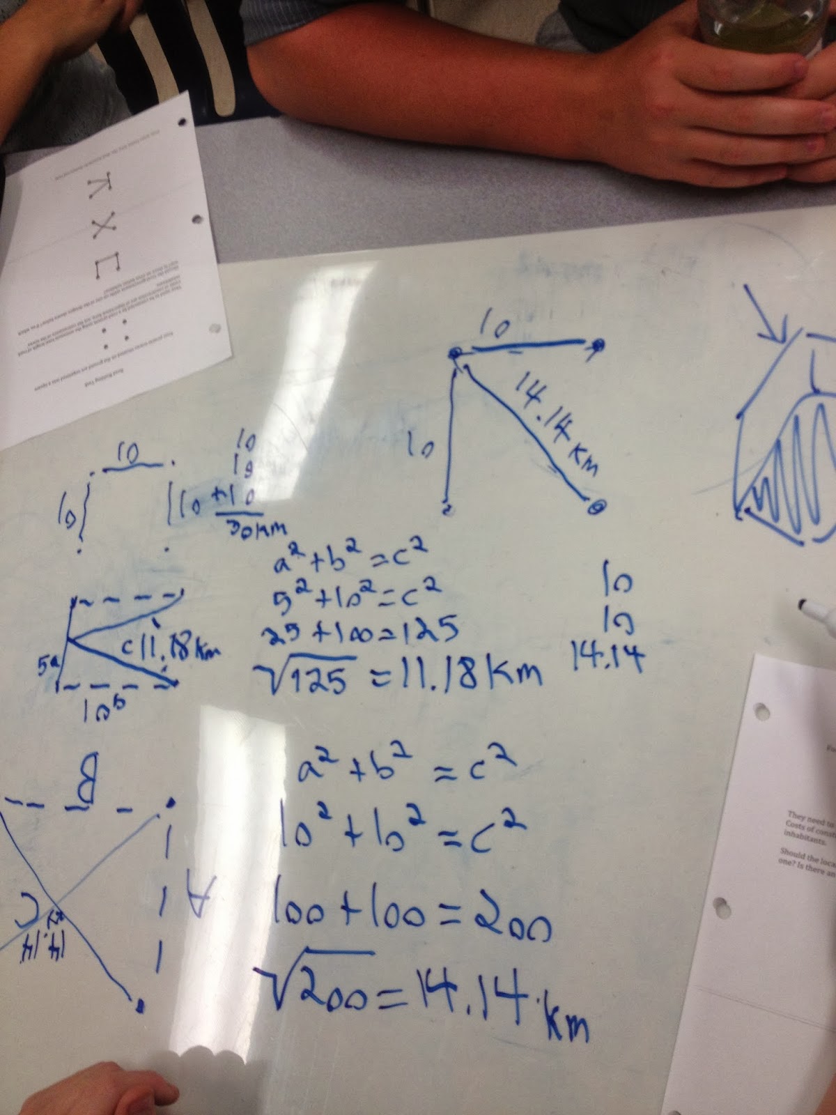 I originally set the towns on the vertices of a 10m by 10m square. This seems like a good place to start building familiarity with the problem. I also included a handout that provided some suggestions to test as well as spark imaginations. These starters give the task a low floor and the extensions provide a high ceiling.