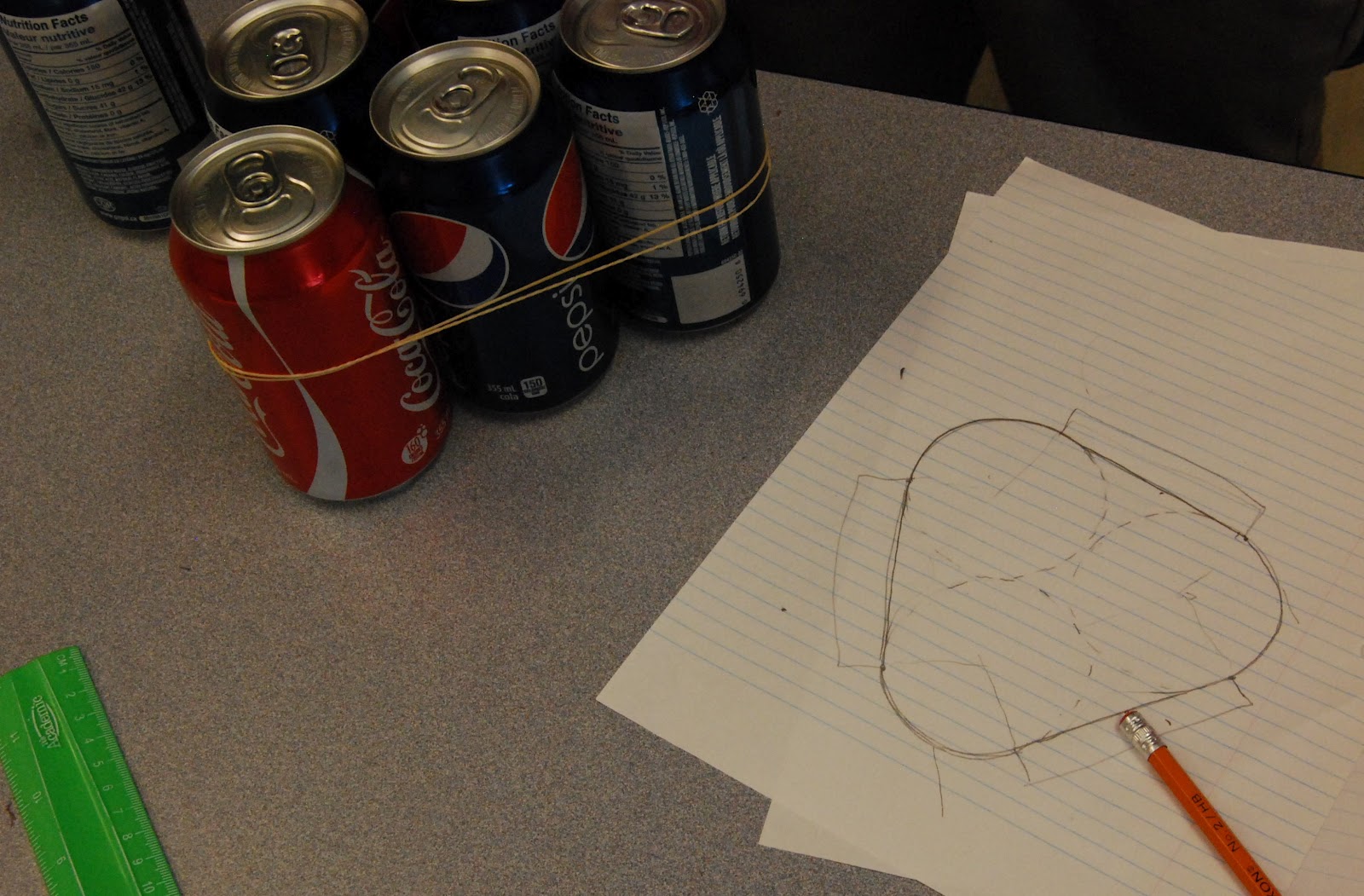 It took a full hour of running around, but most groups finished the class with a rough idea of how they wanted to attack the problem. Up to this point, estimation and conjectures had been made, but few real measurements and calculations to back them up. The next challenge is that of accuracy. How can the formulae be applied to the box? How are the measurements going to be recorded from the cans? How much space needs to be added for tabs?