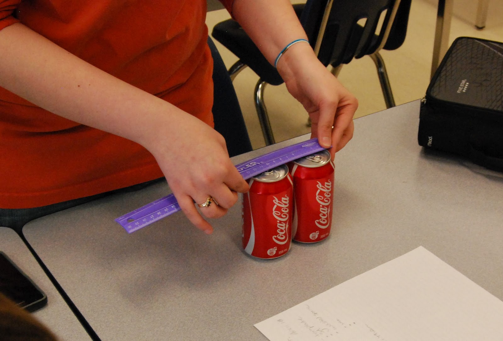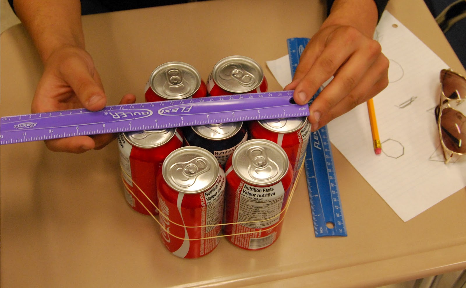 Students got into groups of 3-4 and began scribbling formations on paper. Some asked for cans, others needed ways to hold cans in place for measurements and estimations. One student came up with the idea to hold cans together with elastic bands. This idea was wildly popular and soon I was running to the office for more.