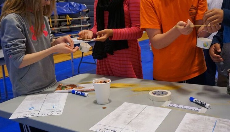 About half way through, we told the kids that there 184 pennies weighed one pound and asked them to estimate how many pieces of spaghetti they would need to hold a 2.5 pound weight. When they gave their reasoning, we went to the crash mats and tested it. Tension ran high as pieces of spaghetti were removed one at a time to reach a breaking point. This was the highlight for many students. We harnessed mathematical intuition, extrapolation, graphical literacy, and even some conversations on gravity, force, and potential energy.